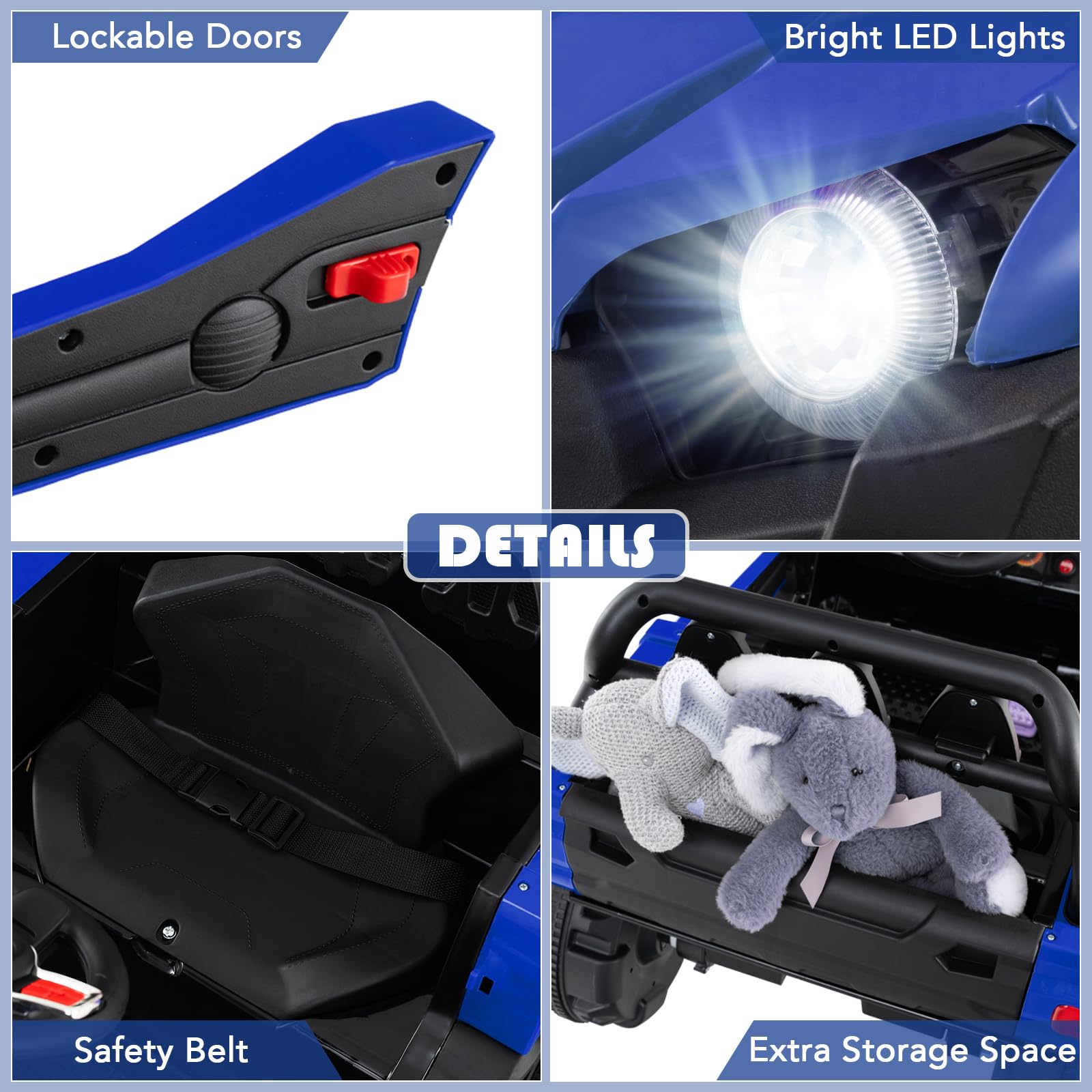 INFANS?12V electric car for kids is designed with double-lock doors, bright LED headlights, and a rotating steering wheel, imitating the real experience of driving an off-road vehicle. This kids’ off-road UTV can be operated by both children and parents. The child controls the steering wheel and pedal through the one-click start, and the use of parental remote control is another way. The remote control toddler car features a smooth start function and a safety belt to ensure a safe playtime on almost any terrain. USB, MP3, and built-in music offer more options according to child's preferences. As a gift, this ride-on car brings even more joy to children.