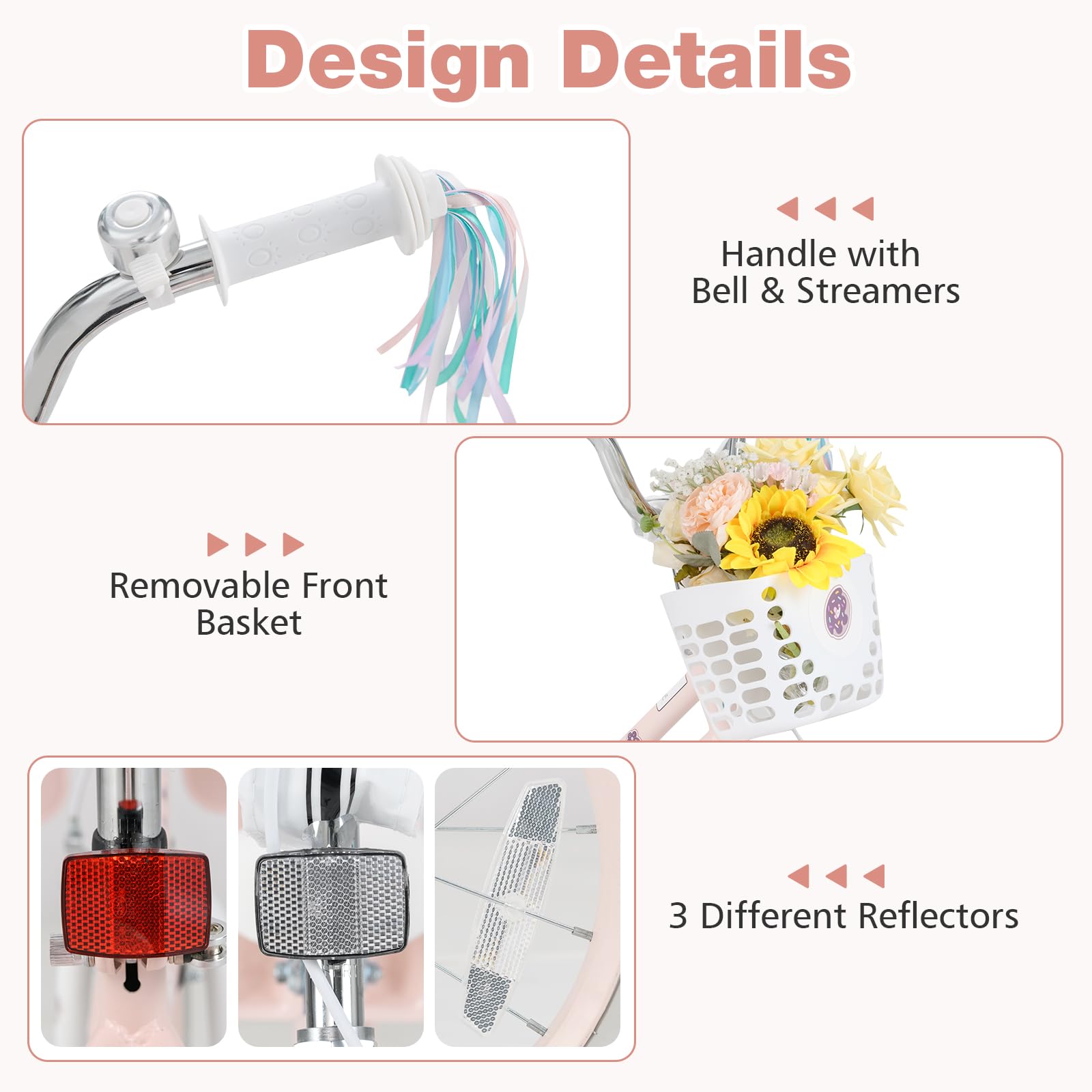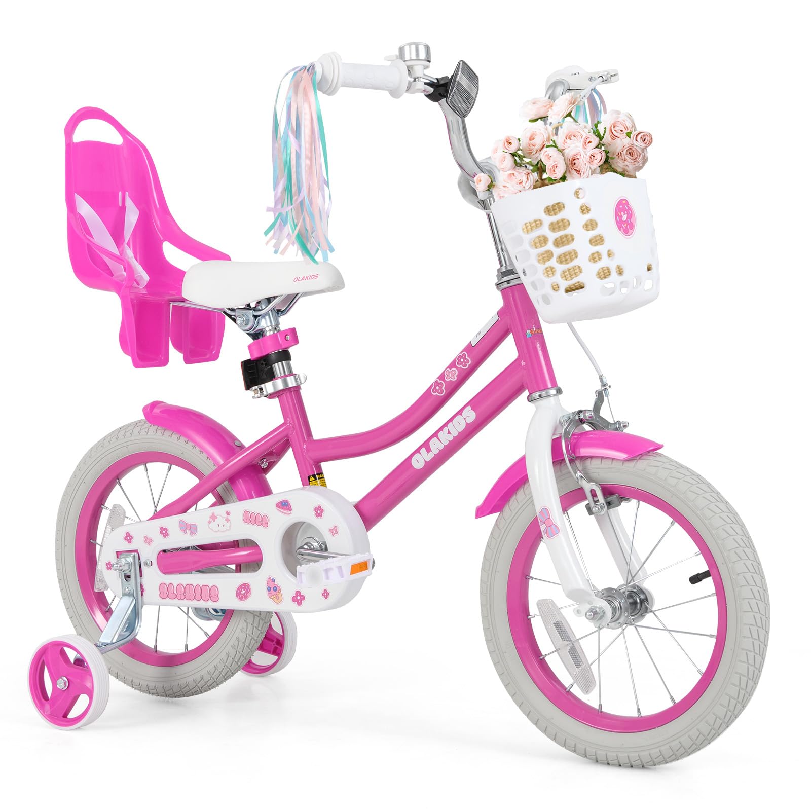 OLAKIDS kids bike is designed with detachable training wheels, height adjustable handlebar and seat to meet different growth stage needs of children. The steel frame stable triangular structure provide more stability and safety for riding. The handbrake and the foot brake with full cover chain guard also provide double safety for young riders, which is easy to operate for children 3+ years old. The soft foam seat and easy grip handlebar keep children comfortable on the ride. 95% of this kids bike for girls is installed, so it can be quickly assembled in 10mins with assembly tools and instructions that are all included in the package.