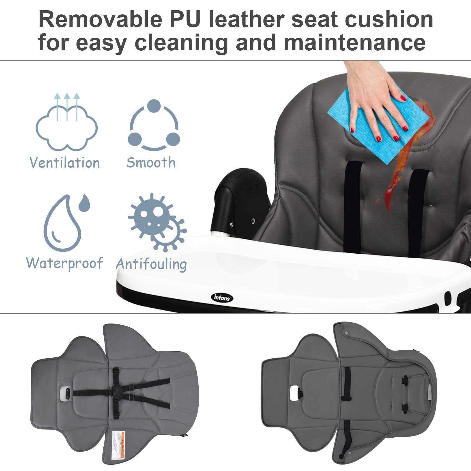 • ?EASY TO CLEAN WITH DETACHABLE DESIGN: Cleanliness has always been a top concern for baby products. Contact with detachable trays and seat cushion, our baby high chair is easy to clean and maintain after daily use. The removable PP top tray is also dishwasher safe. And the PU leather cushion is waterproof that you just need to wipe the smudges with a clean cloth. 5-point safety harness ensures security for your little baby. All the corners of our baby highchair are smooth without sharp edges.