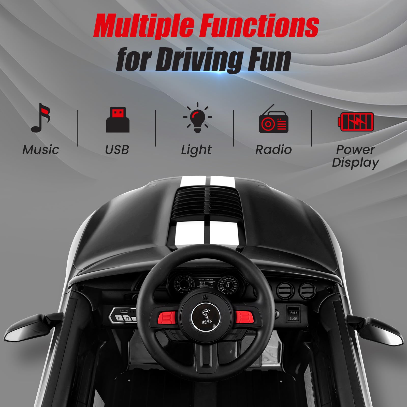 - ??Multi-media Player: The control panel of the kids' electric vehicle features 8 buttons for various function: song selection, radio, light and battery indicator. Additionally, car for kids to drive equipped with USB interface for convenient play.